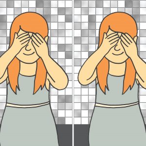 There is a difference in the photo of the orange haired girl covering her eyes. Can you find them all in 16 seconds?