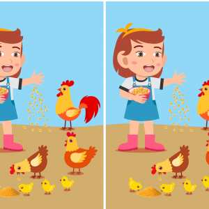Find the difference in this photo in 11 seconds: Young girl feeding corn to a group of chickens
