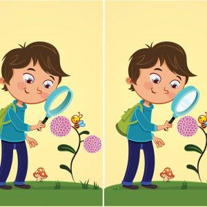 The game finds something special in the image in 25 seconds: The boy studies a flower with a magnifying glass
