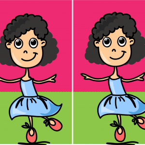 Optical illusion. If you have good eyes, find 1 difference between two images within 26 seconds: Puzzle about young girl dancing in a colorful environment
