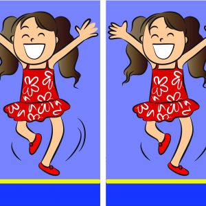 Find the difference in the photo in 32 seconds: excited little girl jumping around in a red floral dress
