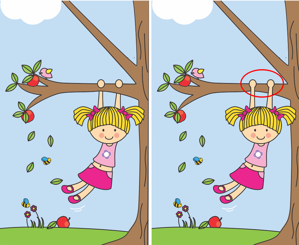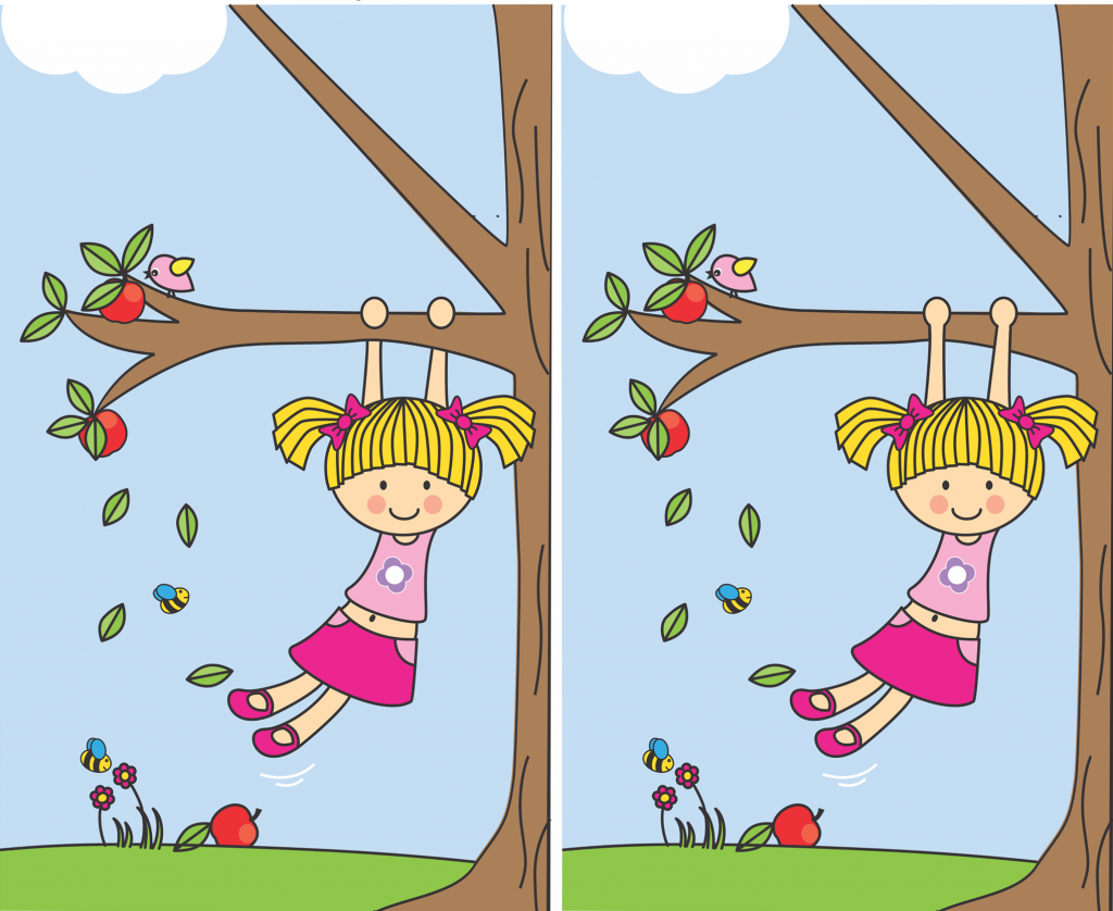 The girl’s playful spirit is infectious. She’s wearing a cute pink skirt, a flower-patterned t-shirt, and bright shoes, all the while hanging from the tree like a true adventurer. But here’s the twist—while the scene seems perfect and identical in two images, there are subtle differences that will challenge your observation skills.